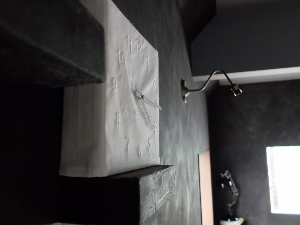 内装壁に、モールテックスを使用してグレーで仕上げました。落ち着いた色合いと滑らかな質感が、モダンで上質な空間を演出します。